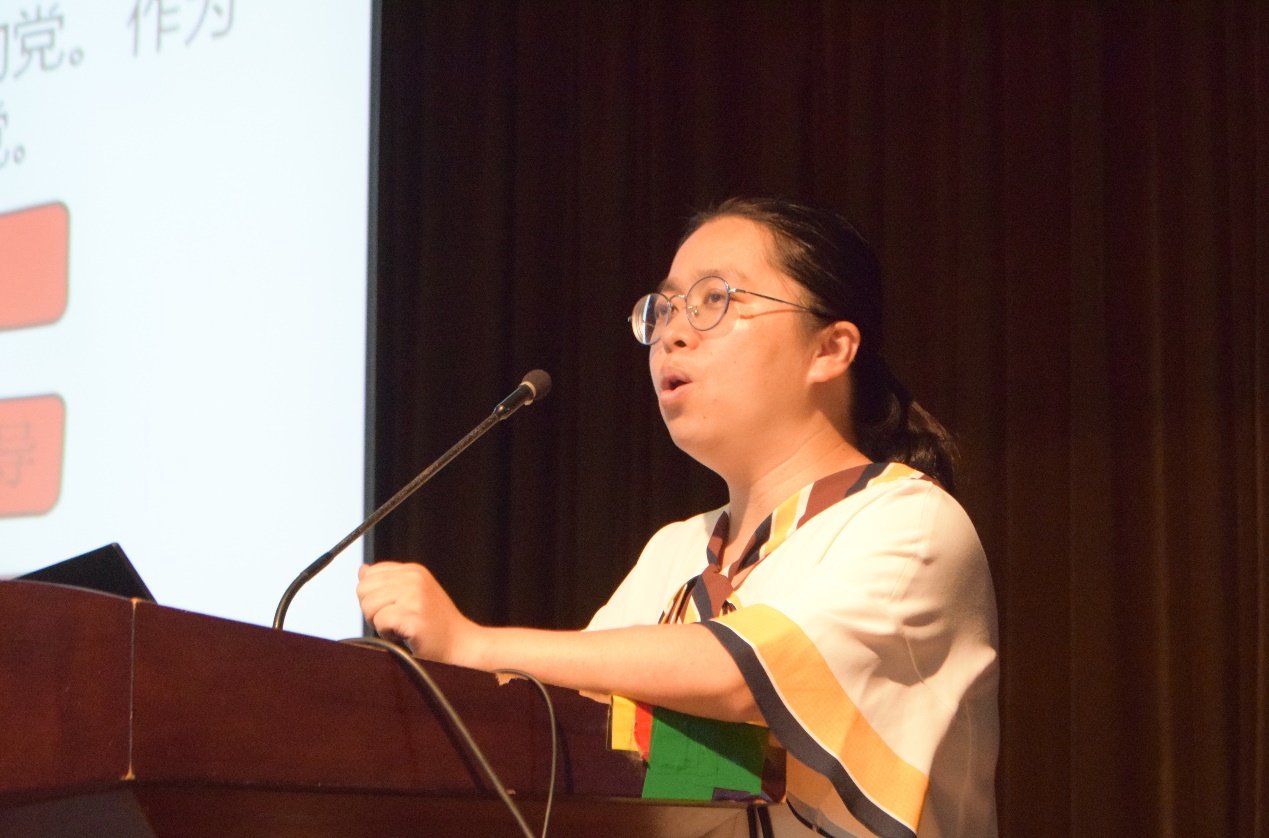 接下来,分团委书记黄凤琼老师带来“青春心向党,奋进新时代”新生入党知识普及教育,她从党的事业发展需要、青年知识分子的前途需要、青年的成长与全面发展等方面向学生们解答“为什么大学生要积极加入共产党”。紧接着,黄老师又向新生们讲解了发展党员的流程,解释了入党申请人、积极分子与发展对象等概念,做了关于“三投票三公示一答辩”执行的工作提示,并且详细地讲述了入党条件、入党申请书的格式以及需要注意的问题、如何写思想汇报等,鼓励新生们积极申请入党,提醒他们要不忘初心、牢记使命。