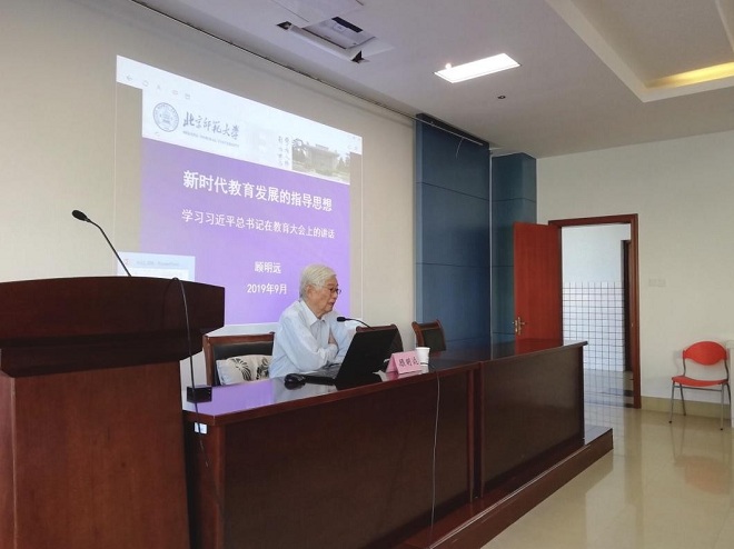 9月23日上午8:30,中国教育学会名誉会长,国家教育咨询委员会委员,新中国比较教育学科创始人之一,教育部教师教育专家委员会主任,北京师范大学资深教授顾明远先生莅临太阳成tyc234cc田家炳楼209会议室,以“新时代教育发展的指导思想——学习习近平总书记在教育大会上的讲话”为主题开展学术讲座,全面深入地解读了全国教育大会的精神。本次讲座由太阳成tyc234cc院长田良臣教授主持,太阳成tyc234cc教育学教师团队及各年级研究生共同参加,现场气氛热烈。