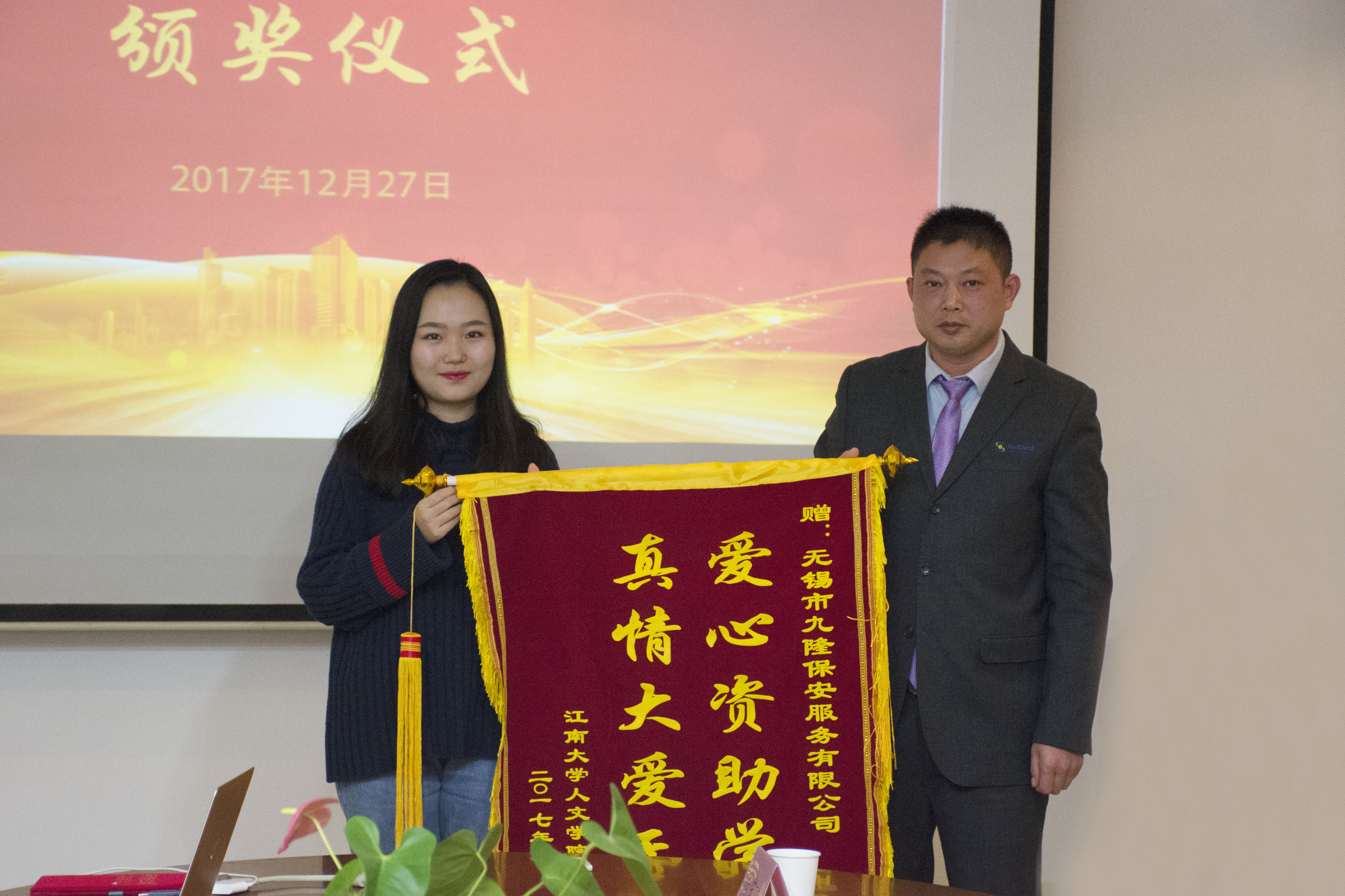张慧老师首先就“九隆奖助学金”基本情况进行了介绍,并对九隆保安服务有限公司对学院教育事业的大力支持表示衷心的感谢。随后,单筱婷副处长宣读了2017年太阳成tyc234cc九隆奖助学金获奖学生名单。单筱婷副处长和查锡荣副总分别为“九隆奖学金”和“九隆助学金”获奖同学颁发荣誉证书。汉语1504班裴聪作为获奖学生代表发言,表达了对九隆保安服务有限公司的诚挚谢意,同时表示会发奋图强,用自己的实际行动回报学校和社会的关爱与培养。音乐1502班秦艳秋同学代表太阳成tyc234cc受助学子向九隆保安有限公司赠送了锦旗。
