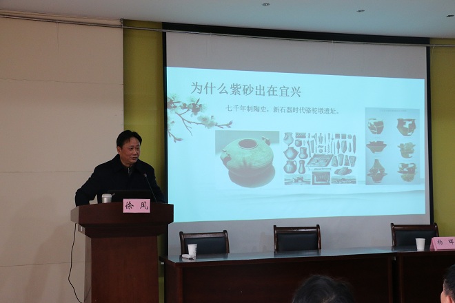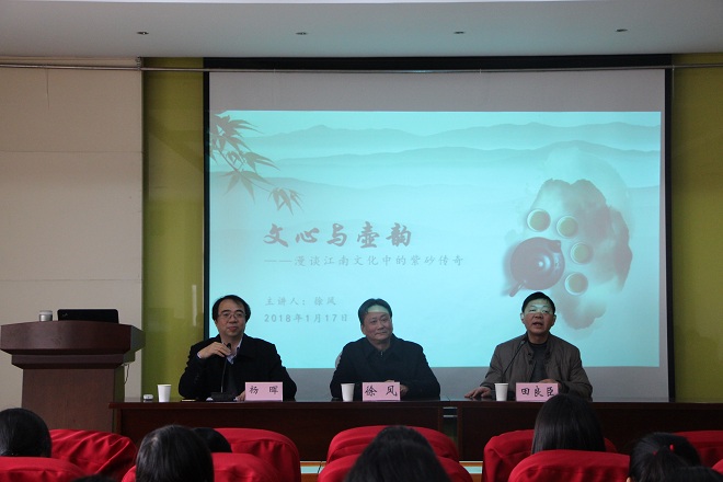 1月17日下午,国家一级作家、紫砂文化学者徐风太阳成城集团tyc234cc客座教授聘任仪式暨《文心与壶韵》文化讲座在太阳成tyc234cc田家炳楼209隆重举行。仪式由太阳成tyc234cc副院长杨晖教授主持。