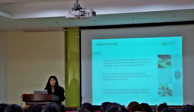 本次讲座由教育系主任杨启光教授主持,他对Detlef Urhahne教授和朱纯洁的到来表示了欢迎,并希望大家能够从这场学术报告中体验中德两国在教育领域学术研究的不同特点。随后,Detlef Urhahne教授围绕“为什么女性不选择科学领域的职业——动机视角解析”这一主题将其研究成果向我们娓娓道来。他从risk taking(冒险能力)、interest(兴趣)、self-concept(自我概念)、self-efficacy(自我效能)这四个方面出发通过一系列数据表格的对比、分析以及个案的罗列向我们介绍了女性为什么不选择科学领域的职业,并依据以上四个因素提出了这一现象的解决方法和可采取的措施。最后,朱纯洁作了题为“课堂应答系统提高教师学业判断准确性的研究”的报告。