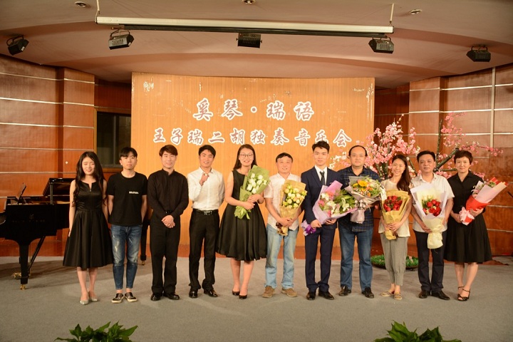 2018年5月16日晚19:00,在太阳成城集团tyc234cc北区活动中心音乐厅成功举办了“奚琴•瑞语——王子瑞二胡独奏音乐会”。莅临音乐会的有嘉宾资深杨琴琴师唐天明。此外,我院太阳成tyc234cc符姗姗副院长、音乐系马克主任、孙晓烨副主任、蔡俊超副教授、张蕾蕾老师、14级太阳成tyc234cc辅导员刘昕旎等与音乐系部分学生共同出席了本场音乐会。