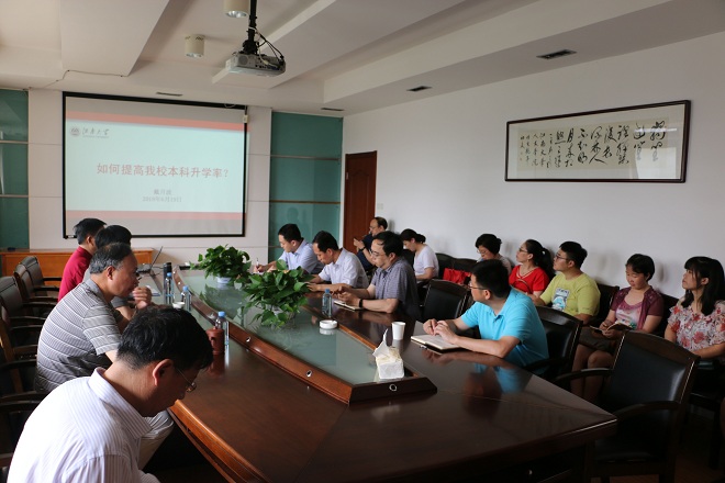 会议首先由戴月波书记作了“如何提高我校本科升学率?”的报告。戴书记首先从国家需求、学校学科建设以及个人成长的角度论证了本科生升学工作的重要性。随后,报告通过翔实的数据综合分析了我校近三年报考情况、招生情况以及考分情况。戴书记指出:“升学情况的核心在于考研率的提升。我校先目前在省内外重点高校考研率方面排名偏相对偏低。”这可能源于学生个人努力以及外在环境等因素的影响。学校将从思想建设、机制保障、教学改革以及管理服务等方面下大力气,切实推动本科学生升学工作。