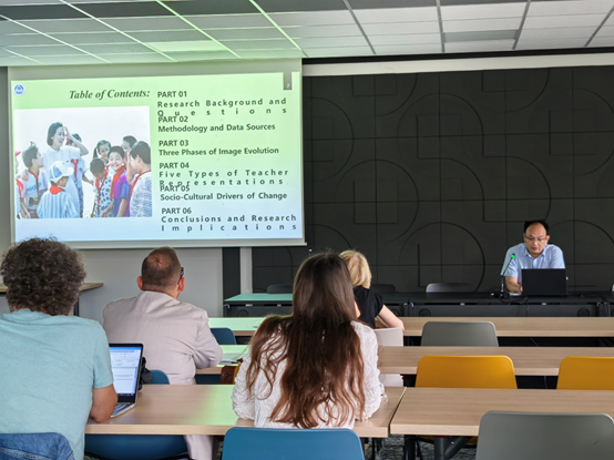 法国里尔当地时间7月8日上午9点,王文礼参加了A8 SES 01 A小组会议,会议主题为:《电影与儿童文学中的教师形象》,并做了《从圣人到个体:1978年至2020年中国电影中的教师形象》报告,探讨了1978年至2020年中国电影中教师形象的演变,通过电影文本分析方法,对14部具有代表性的影片进行了研究,以识别教师形象描绘的关键阶段,包括“神圣化”、“去神秘化”和“多维度个性化”。将教师形象分为五种类型:道德模范、专业技术型教师、个性化实践者、基层服务型教师和理想化综合型教师。这些转变反映了中国社会更广泛的经济社会政治、文化变革,如教育改革、城乡差距以及社会价值观的转变。